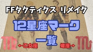 FFタクティクス 【FFTリメイク】12星座マーク一覧 ~乙女座と蠍座を間違えやすい~ これは星座記号をまとめた記事です。一応、FFタクティクスイヴァリースクロニクルズの攻略記事です。星座記号をまとめて表にしたので、「この記号は12星座のどれだったっけ……」となったら見てください。 2025.10.01 FFタクティクス攻略情報・まとめ